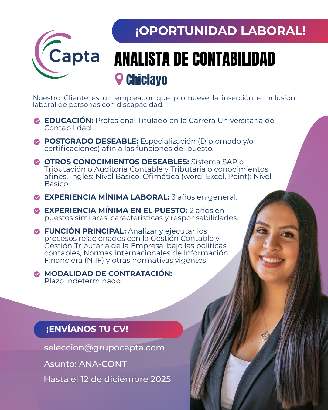 Conoce nuestras ofertas laborales. Nos encontramos en búsqueda del mejor talento. ¡Postula o Refiere! Enviar CV Analista de Contabilidad Trabajo para la ciudad de Chiclayo VER ANUNCIO